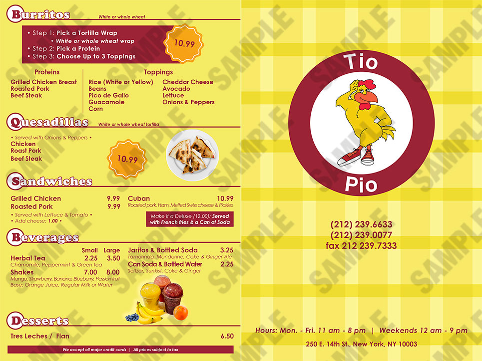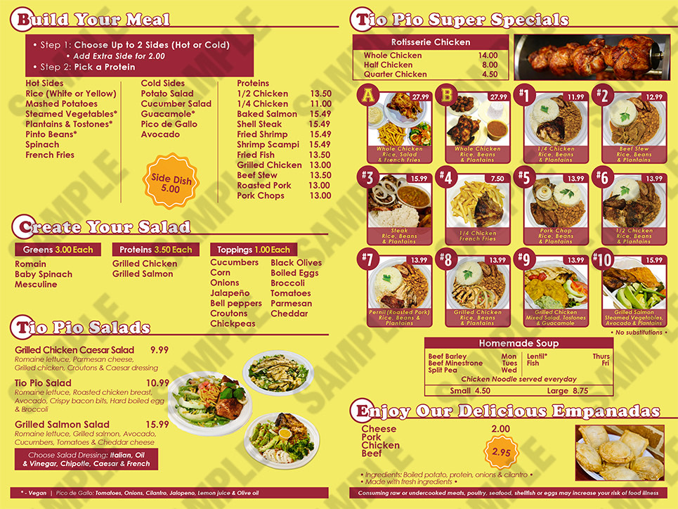 The menu at Tio Pio impresses with its vibrant flavors and generous portions, making it a standout in the East Village. The Potato Salad is a refreshing starter, perfectly seasoned and creamy without being heavy. Among the heartier options, the Quarter Chicken Rice with Rice Beans and Plantains Ji and the 1 2 Chicken with Rice Beans and Plantains deliver a comforting combination of tender, well-marinated chicken paired with savory rice and beans and sweet, caramelized plantains. Each plate feels thoughtfully balanced, highlighting the rich culinary traditions that define the restaurant. To complement these dishes, the Tio Pio Large Lemonade offers a crisp, citrusy refreshment that cuts through the richness of the main courses, rounding out the meal beautifully. Overall, the menu strikes a satisfying harmony between classic flavors and hearty portions, ensuring diners leave with both a full stomach and a memorable taste experience.